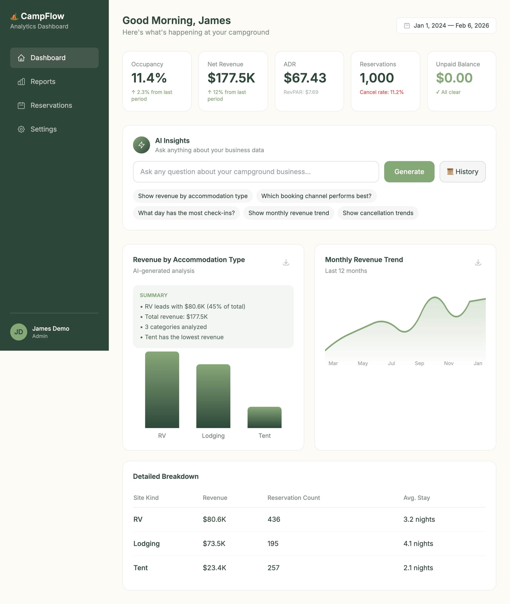 AI-powered business analytics dashboard with real-time data visualization, reservations management, and intelligent reporting.